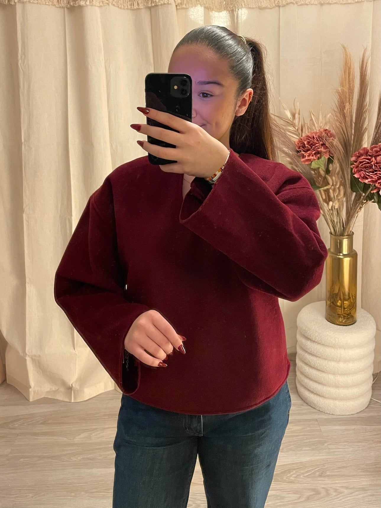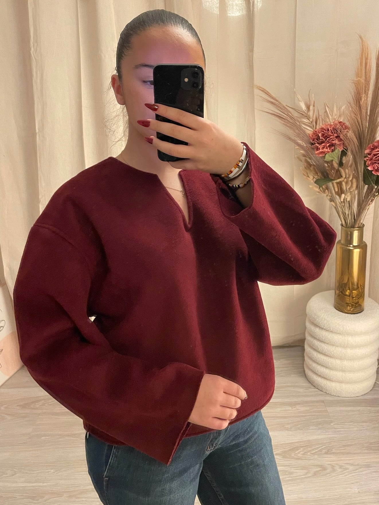 Adoptez le parfait équilibre entre confort et élégance avec ce haut en polaire bordeaux. Doux et chaud, il est idéal pour les journées fraîches tout en apportant une touche sophistiquée à votre tenue.
