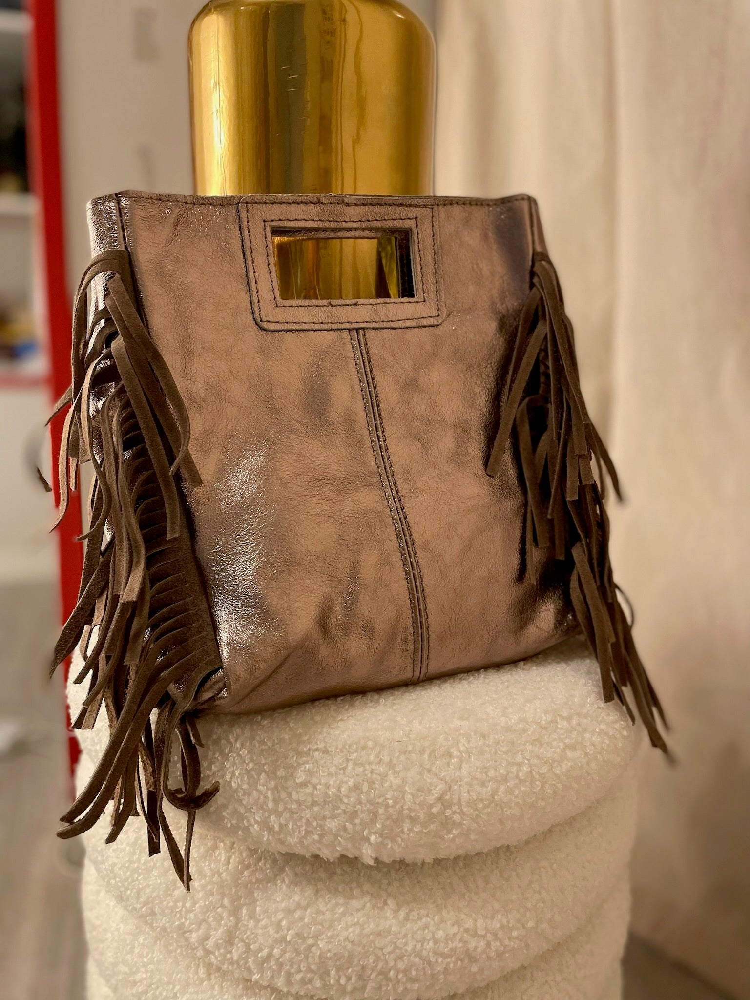 Cuir irisé haut de gamme : Un effet brillant et lumineux qui attire le regard avec élégance. Détails frangés : Longues franges sur les côtés pour une touche bohème chic et un style affirmé. Format pratique : Suffisamment spacieux pour accueillir vos essentiels tout en restant léger et facile à porter. Fermeture sécurisée : Protégez vos effets personnels avec une fermeture élégante et fonctionnelle. Polyvalent : Idéal pour une tenue casual avec un jean ou pour apporter une touche originale à une robe plus sophistiquée.