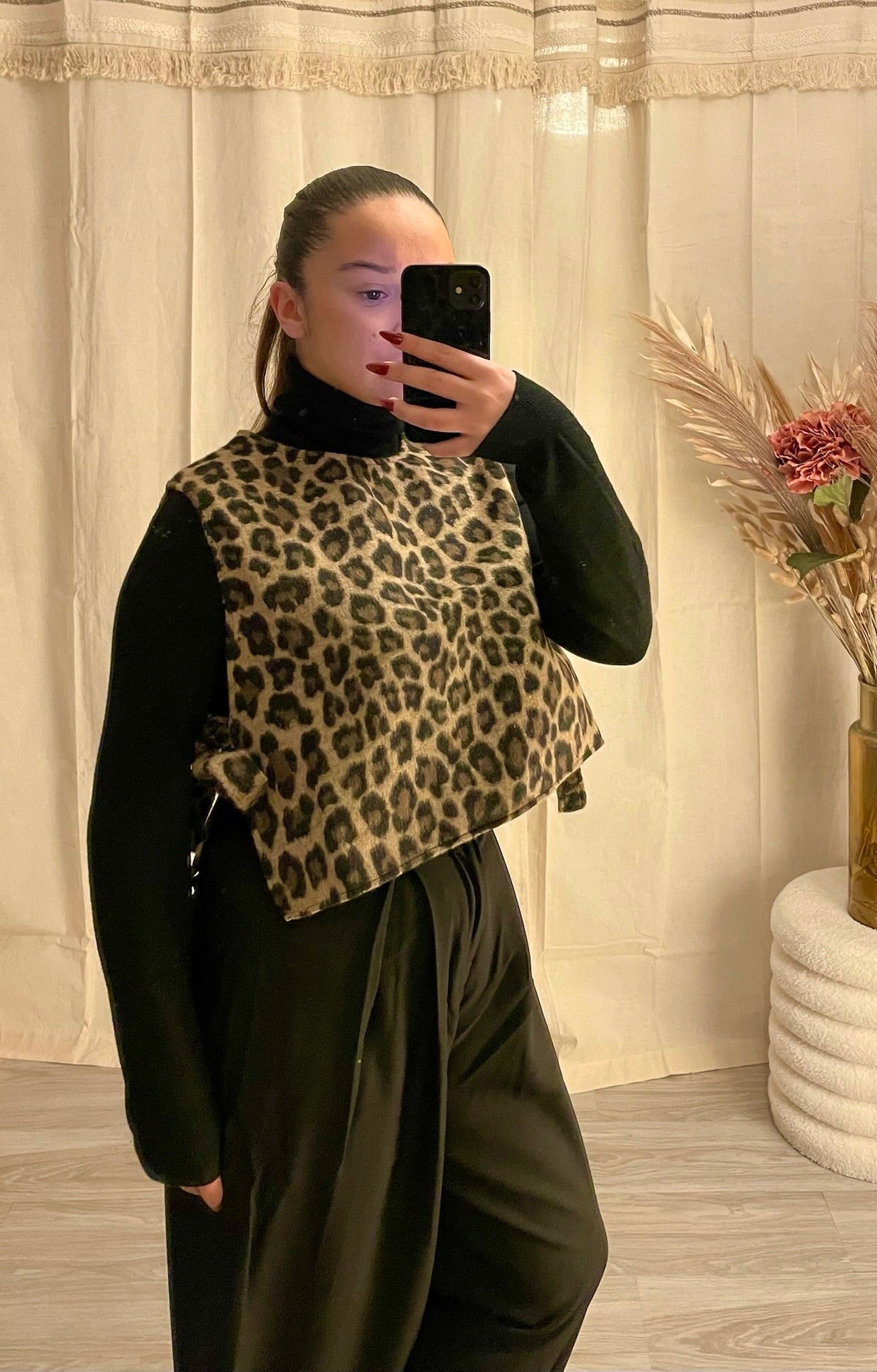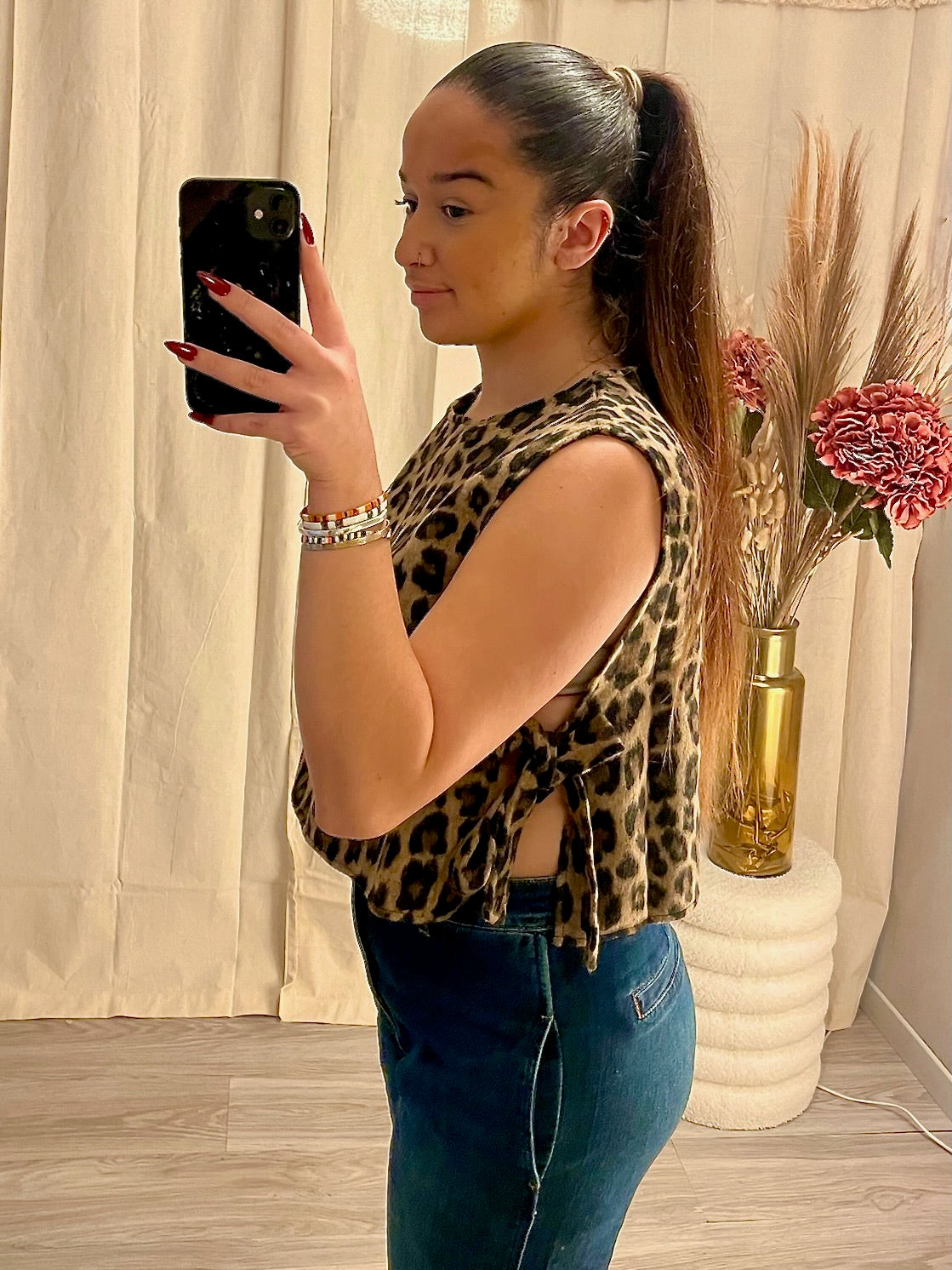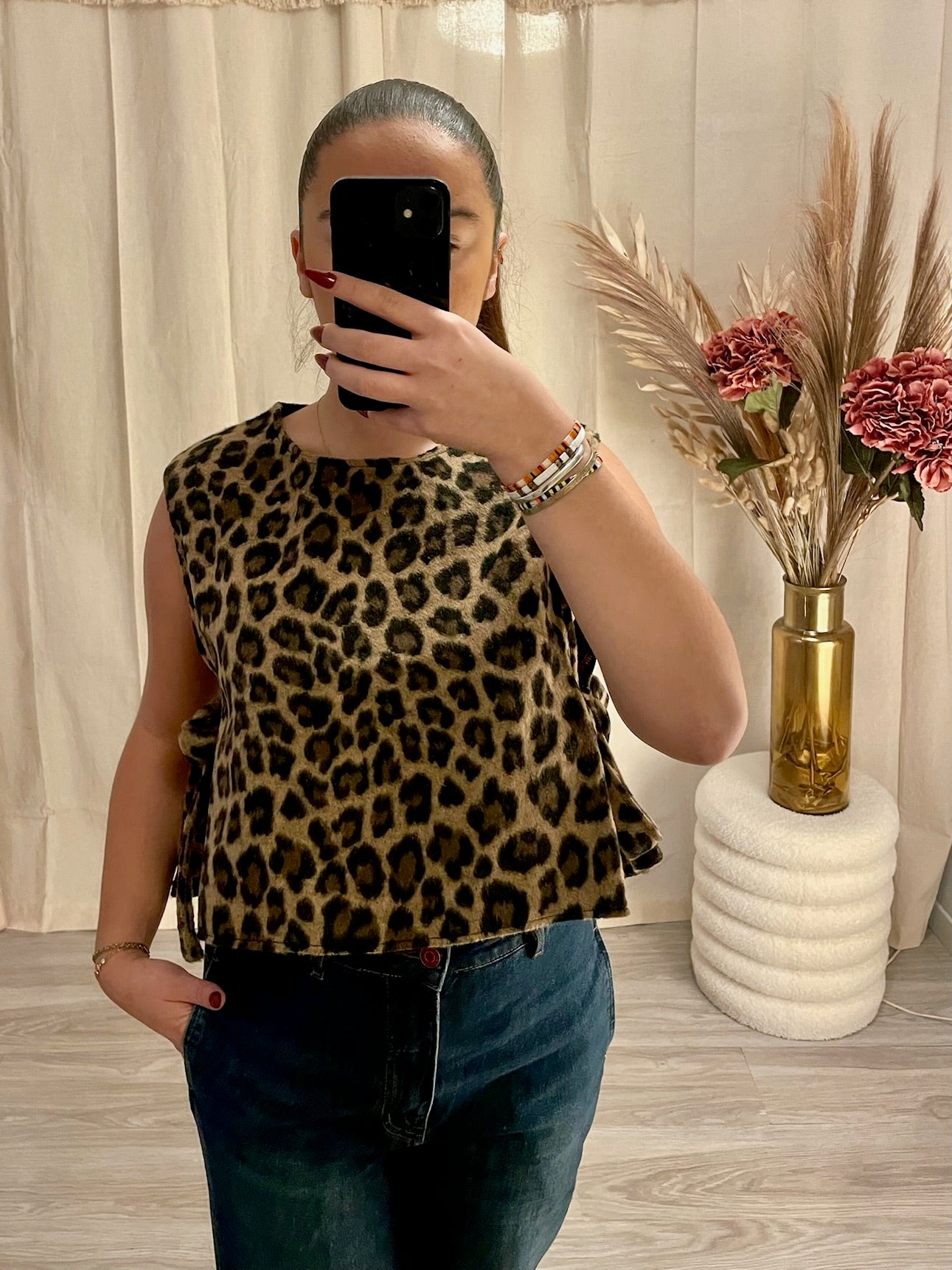 Imprimé léopard intemporel : Un motif animalier chic qui ne passe pas inaperçu. Coupe sans manches : Parfait pour les journées chaudes ou pour superposer avec une veste. Fermeture par nœuds sur les côtés : Un détail féminin et ajustable pour un look personnalisé. Tissu léger et agréable : Offre un confort optimal tout au long de la journée. Style polyvalent : Portez le avec un pantalon taille haute pour un look sophistiqué ou avec un jean pour une allure décontractée.